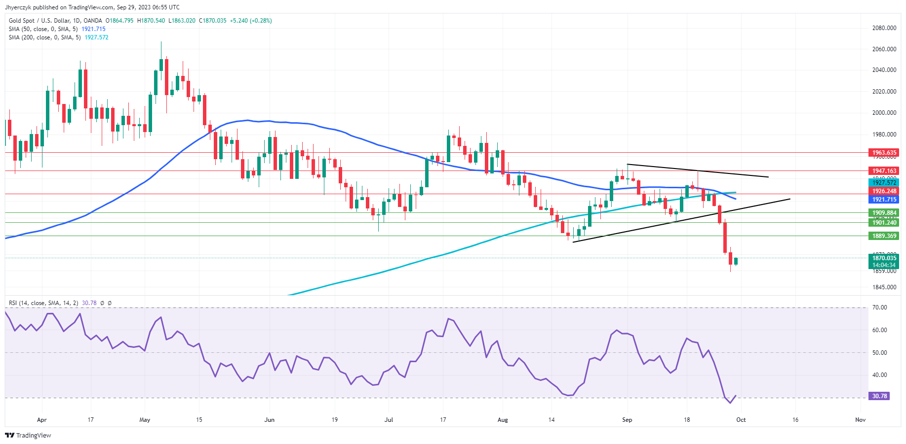 Daily Gold XAU/USDGold’s (XAU/USD) current daily price of 1870.16 sits below both its 200-Day and 50-Day moving averages, indicating a potential bearish momentum.
