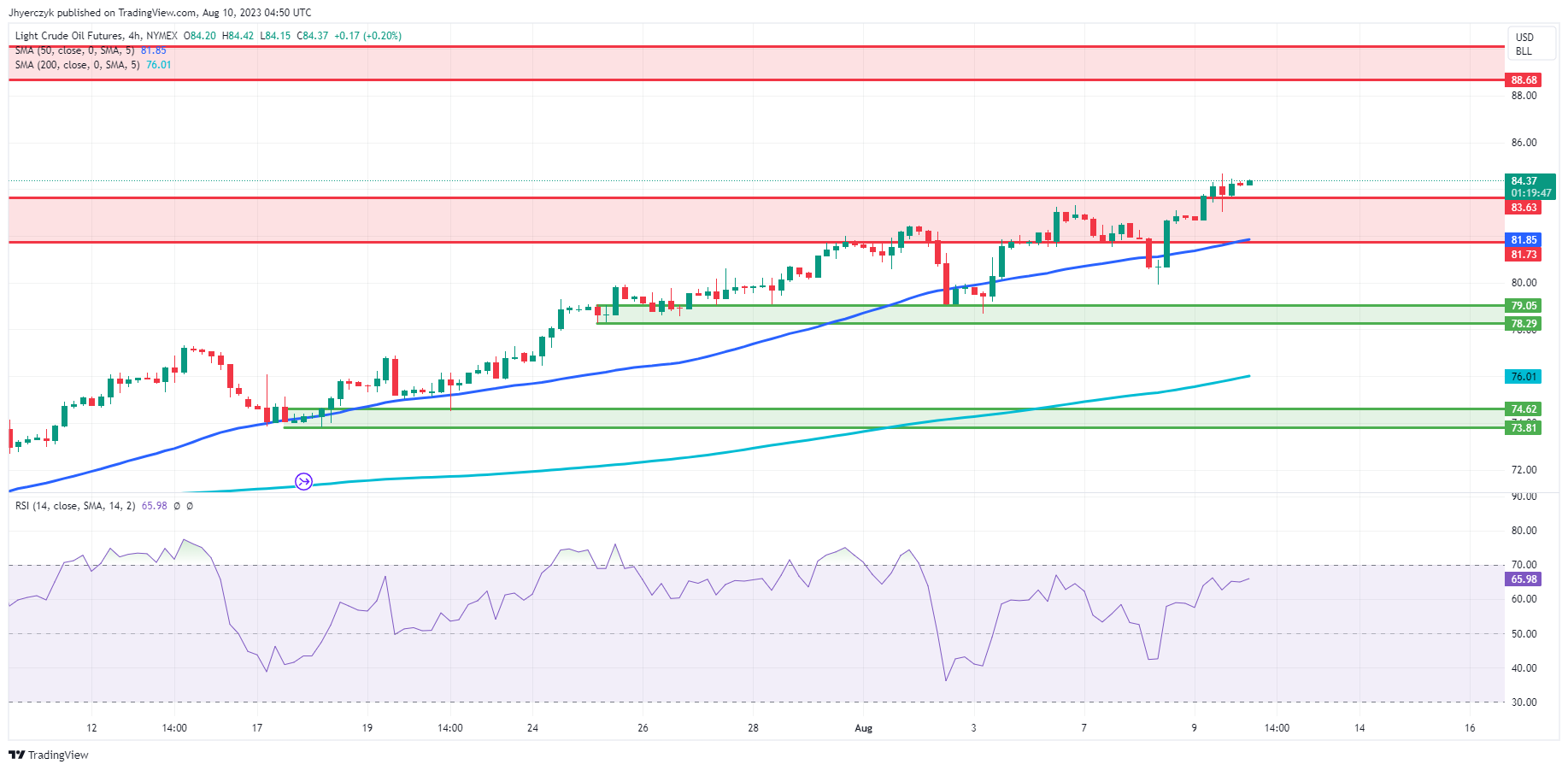 Positioned above the main support area ($79.05 to $78.29) and a former resistance area ($83.63 to $81.73) but still below the main resistance range ($88.68 to $90.10), the Crude Oil market leans towards a bullish sentiment in the 4-hour timeframe.