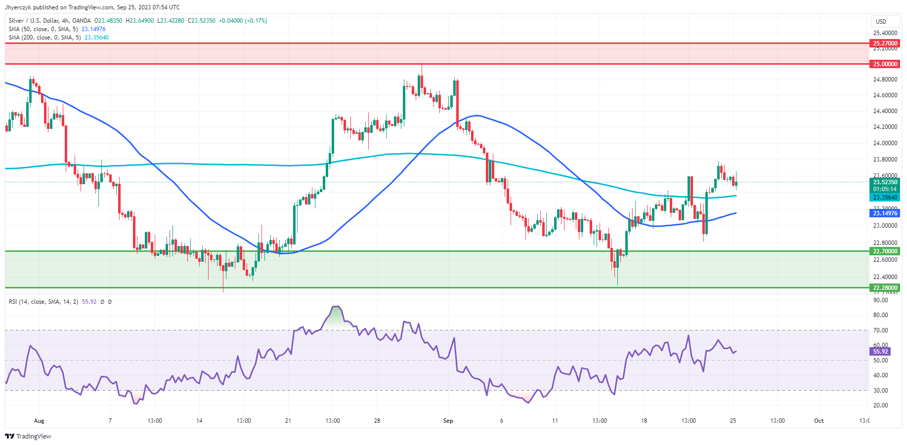 When observing support and resistance levels, the present price resides between the main support area (22.70 to 22.28) and the main resistance area (25.00 to 25.27). In light of the mentioned indicators, the market sentiment for silver seems moderately bullish in the near term.