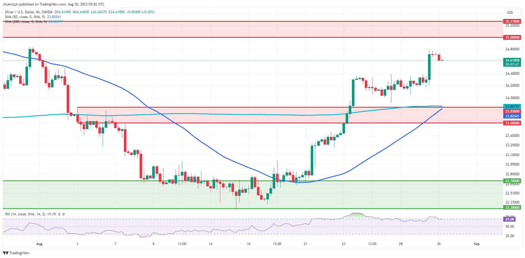 On the support and resistance front, the current price is above the main support range of $23.850 to $23.600. It is approaching the main resistance area between $25.00 to $25.27, affirming bullish momentum. Using these technical indicators, we consider the current market sentiment for Silver bullish.