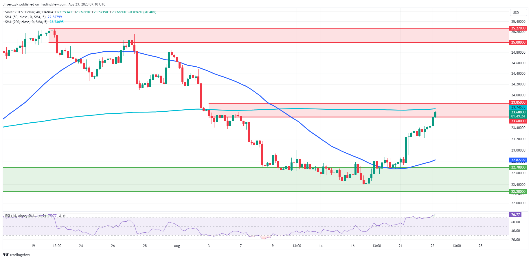 Finally, while the price is nearing the main resistance area between 23.60 to 23.85, it’s comfortably above the main support area of 22.70 to 22.28. Taking all these factors into account, the current market sentiment for Silver is cautiously bullish, but with the RSI indicating overbought conditions, some retracement might be on the horizon.